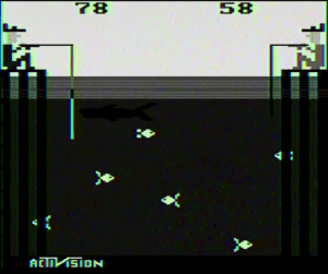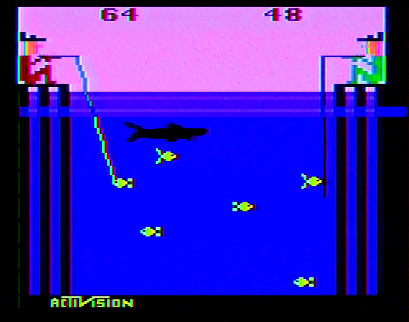 David Crane said that Fishing Derby started life as a basic aquarium simulator. The sky, the water and horizontal bands of goldfish swimming around were there from the beginning, and while it was visually interesting and regularly mesmerized people from sales and marketing, there wasn’t much of game to it. Crane felt the scoring aspect where deeper fish would be worth more points was a pretty straightforward risk/reward system, but the game still lacked any sort of threat. After a brainstorming session, the four developers felt that having a shark in play that could eat the fish made sense, and Bob Whitehead provided some graphical techniques he’d come up with for Boxing to create it. In all the visual fidelity and artistry on display in Fishing Derby rivals anything Atari had sold up to that point.