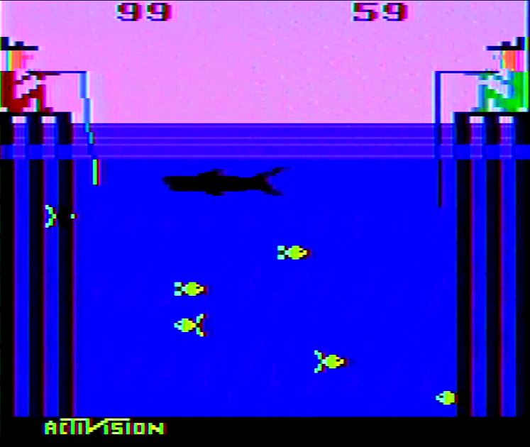The first thing that jumps out when Fishing Derby itself is loaded up is how colorful the game is. The large background sprites representing the anglers come in multiple colors – the most human any person has looked in a VCS game outside of John Dunn’s Superman – the water is a bold blue, and the sky the color of a sunrise, instantly placing this game at a moment of real time. The fish are all made up of bright, smoothly animating sprites underneath color-cycling waves and a fast moving, hungry shark. The fishing poles move oddly but with a smooth motion that really hasn’t been seen in any VCS game up to this point. And to top it all off is the Activision logo in the corner, boldly stating this game’s origin and providing one final bit of marketing oomph. And the game itself is completely unlikely anything else not just on the VCS, but on the market period.