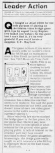 Bridge was featured in the ANALOG magazine’s VCS update in the May/June 1981 issue, and despite lamenting that Kaplan’s game did not allow the opposing team to make its own contract bids, it nevertheless would play intelligently each round and was one of the better adult games on the VCS. The game also had a short writeup in the Muncie Star that September, where the author called it one of the finest practice tools for the game around. The game was even reviewed in 1983, when Calgary Herald writer Bill Musselwhite reviewed the game favorably, stating that despite its limitations it is a fun game that can help a player improve. Positive praise from bridge fans aside, however, Bridge is one of the harder Activision titles to come across today, which suggests it was just as niche a seller as one would expect. As it turns out, being targeted at adults when the primary audience for home games at the time was much younger didn’t appear to make Bridge a mass-market phenomenon. According to a consumer column in the Wilkes-Barr Times Leader from 1984, Bridge was discontinued in late 1983 and was not widely stocked in the first place, but did better for the company on the east coast than anywhere else. Activision at the time did appear to still have some copies of the bugfixed version available in case of returns… or in this case, for a bridge fan still looking for it.