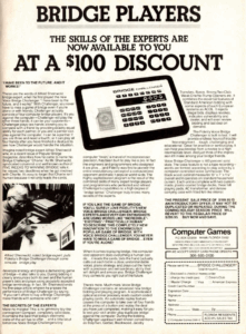 Bridge was the first game Larry Kaplan wrote under the Activision label. Kaplan had initially planned to join Activision with the other three founding programmers in 1979, but after having a falling out over the business plan, abandoned that effort to work for Commodore on a speech synthesis project. After quickly seeing the writing on the wall for that effort, he rejoined his Activision comrades around January 1980, albeit with a 50% cut in stock options for coming in late. Kaplan said that he’d played bridge for about 10 years by that point and really enjoyed the game, playing in bridge duplicate tournaments with Jack Verson, a friend of his. Kaplan decided to make a video game version of it to help “train” people, or at the least keep them entertained when they couldn’t find three other players. Verson, a game developer in his own right, became a helper on the project. Kaplan said Verson assisted with the AI, bidding and playing, adding that while he and Verson had programmed together at work they’d never actually co-wrote a game. Kaplan also believes David Crane assisted him with the graphics on the Bridge cart, something that Crane didn’t seem to have much recollection of, though Crane did note that his mother, an avid bridge player, loved Kaplan’s cartridge. In all, Bridge took Kaplan around six months, and ended up needing a 4-kilobyte ROM chip to store the program – which he considered a source of some shame, given that Activision’s previous releases all fit on 2k cartridges. The initial release had a glitch where the computer would make an illegal bid sometimes and crash the game, requiring them to change the ROMs for future runs of the cartridge and stockpile a few in case of consumer complaints.