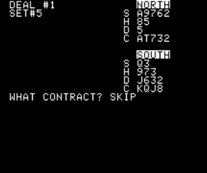 The cartridge itself has two main modes. The first three game types allow for bidding between the player and your computer partner, with the opposing team members, east and west, passing on their turns. The computer will bid based on the cards in its hand, which normally speaking the player cannot see unless they flip the left difficulty switch to A. These three game types change what the minimum partnership point counts are – essentially a system of evaluating the strength of players’ hands; game type 1 has 21 or more, then 25 and 29 for the following variations. Game types 4 through 7 skip the bidding process and simply allow the player to select the contract, with minimum point counts ranging from 21 through 29 again.