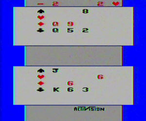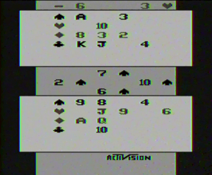 While computerized bridge options existed by the end of the 1970s, such as the standalone Bridge Challenger or the Apple II Bridge Challenger game, these were expensive options. Between the VCS’s growing popularity and relatively low cost compared to an Apple II or dedicated bridge machine, producing a version for Atari’s machine was a sensible alternative. Additionally, even though by the time Activision’s game had come out, bridge was already fading as a pastime among the primary audience for the VCS – predominantly kids and teenagers – there was still being a pretty sizable number of people interested in the game broadly. And since these kids typically lived in family units, it made some sense for a bridge game to exist targeting older crowds, such as parents.