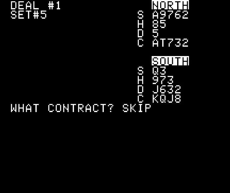 The cartridge itself has two main modes. The first three game types allow for bidding between the player and your computer partner, with the opposing team members, east and west, passing on their turns. The computer will bid based on the cards in its hand, which normally speaking the player cannot see unless they flip the left difficulty switch to A. These three game types change what the minimum partnership point counts are – essentially a system of evaluating the strength of players’ hands; game type 1 has 21 or more, then 25 and 29 for the following variations. Game types 4 through 7 skip the bidding process and simply allow the player to select the contract, with minimum point counts ranging from 21 through 29 again.