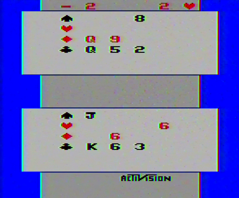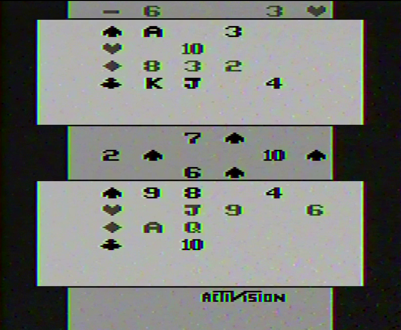 As for Kaplan, once Bridge was completed he set about making assembler tools for the Intellivision platform so that Activision’s team could begin making games for that console as well. In 1981 he would come back to game development on the VCS with his final game on the platform, the well-regarded Kaboom!. While Bridge is pretty much the exact opposite of that frenetic release, there really isn’t anything like it on the VCS library… or any of its competitors, for that matter. Bridge essentially stands alone on the home console space as the sole attempt to translate the card game ever, as far as I can tell. Perhaps it’s due to bridge players’ preference for in-person sessions or online play, or maybe the primary audience for home console gaming has just never come around to bridge. In any case, this is a perfectly playable attempt at the game.