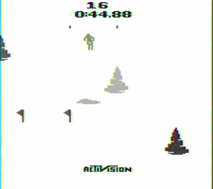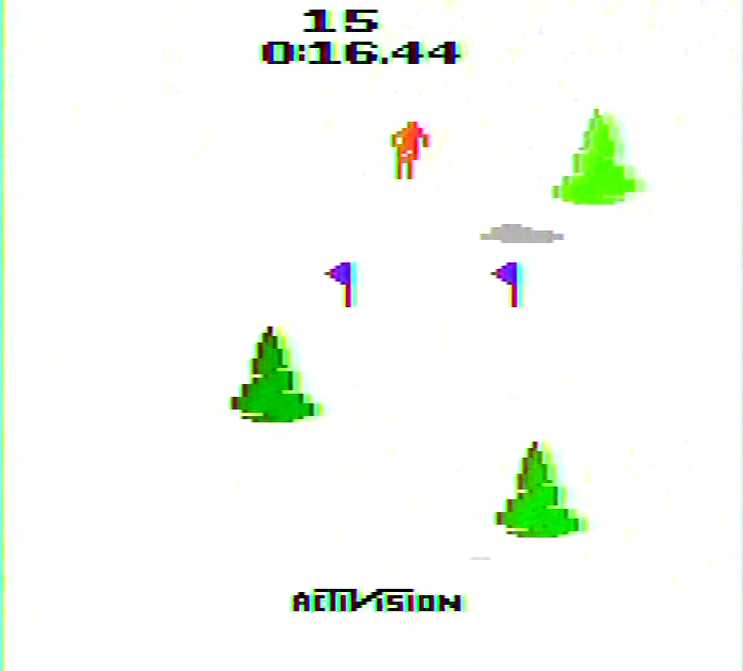 Owing to how quickly a trip down the virtual mountain can take, Whitehead describes Skiing as a game for “short attention spans.” As he put it, it’s a game where the player can go through the course quickly and then work on making their run more efficient to beat their time. If you fall and screw up, you can quickly reset and hop right back to it at the top of the slope, ready to try again. Accordingly, just as with Dragster and Maze Craze, you can restart a slalom run by pressing the button on the controller at its conclusion. While in downhill modes this button’s purpose is shifted to jumping, this quick restart functionality feeds into the game’s design ethos of quick sessions that draw the player into trying again.