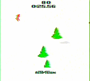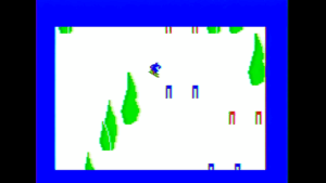 The earliest released skiing game on a home console, after a fashion, comes to us courtesy of Larry Kaplan with his VCS launch title Street Racer. Kaplan included a “slalom” variation in this title where players use the paddles to navigate between gates. Functionally this doesn’t play all that differently from the other game types on the cartridge – you’re still using a paddle to move your vehicle left and right to avoid obstacles and hit targets – but it does show how slalom courses would become a popular choice for skiing games. Nevertheless, this is essentially using the same elements Kaplan had already put in place for his racing game to get some more longevity out of it, and while it’s better than the standard street racing game modes it’s still a loose interpretation of the sport.