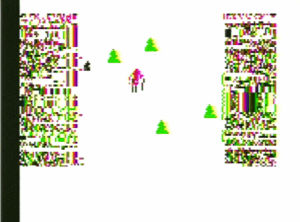 But there were a few other attempts at console skiing games in between 1980 and 1988, though it’s a matter of taste on whether or not they reach the same height’s as Whitehead’s game in terms of sheer fun and replayability. Starting in 1982, The Bally Arcade played host to Super Slope, a skiing game by indie development label Esoterica. Despite being published on cassette tape and loaded using a BASIC cartridge, this game runs entirely in Z-80 machine language. It makes some interesting choices – graphical interpretations of the game code are lined along the sides to be the “crowd” watching the player ski, and while there are some aesthetic glitches and the game can crash, it’s still a pretty quick and admirable version of the sport for a console that really didn’t have anything else of the sort, and was reviewed, glitches and all, in the pages of the Arcadian newsletter. Writer Michael Prosise considered on par with the Alpine Ski arcade game, outside of its inscrutable scoring system and the occasional graphical and audio glitches.