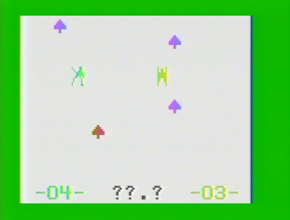 The earliest released skiing game on a home console, after a fashion, comes to us courtesy of Larry Kaplan with his VCS launch title Street Racer. Kaplan included a “slalom” variation in this title where players use the paddles to navigate between gates. Functionally this doesn’t play all that differently from the other game types on the cartridge – you’re still using a paddle to move your vehicle left and right to avoid obstacles and hit targets – but it does show how slalom courses would become a popular choice for skiing games. Nevertheless, this is essentially using the same elements Kaplan had already put in place for his racing game to get some more longevity out of it, and while it’s better than the standard street racing game modes it’s still a loose interpretation of the sport.